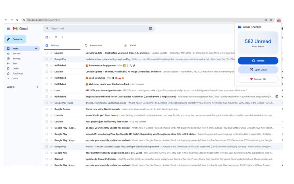 “Gmail Email Checker Plus does not collect, store, or transmit any user data to external servers. It communicates directly with the Gmail API (mail.google.com) from your browser to display your unread email count. All data remains local on your device.”